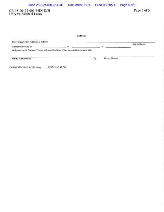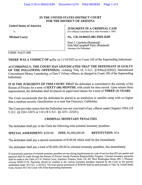 Lacey, co-founder of Backpage.com, was sentenced to five years in prison and fined $3 million. Spear, former executive vice president of Backpage, and Brunst, former chief financial officer, were each sentenced to 10 years in prison, with Brunst also ordered to pay a $50,000 fine.